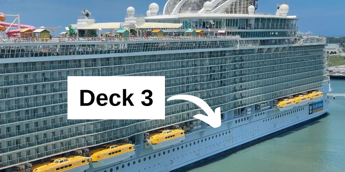 Cruise ships number their decks ascending from the bottom of the ship, so Deck 3 is the third-lowest deck on the ship. This usually puts it around the waterline, or just above. It’s often the lowest accessible deck on a cruise ship for passengers.