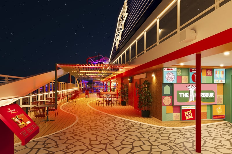 Families looking for outdoor thrills will find them at The Harbour, an open-air entertainment area designed as a theme park-style destination on board the ship.