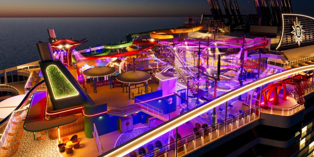 The attraction will include an adventure rope course, waterslides and what MSC Cruises describes as the longest dry slide at sea. Guests will also be able to try the Cliffhanger attraction, which the cruise line says will be Europe’s first over-water swing.