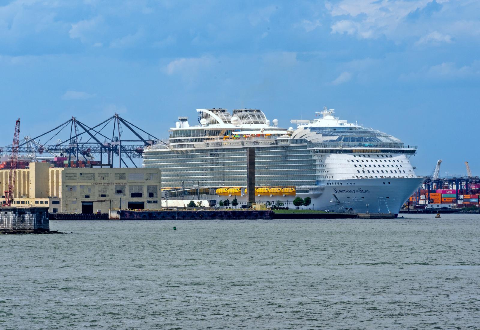 Royal Caribbean’s mega ship Symphony of the Seas was supposed to set sail yesterday on a 7-day sailing to The Bahamas. Instead, the 6,680-max-capacity ship is still docked in the New Jersey Cape Liberty Cruise Port in Bayonne today.