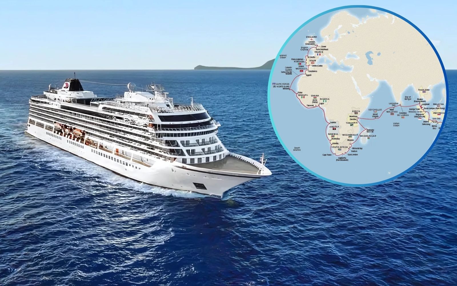 It will then cross the Pacific, with stops in Hawaii and French Polynesia, followed by New Zealand, Australia, Southeast Asia, and Africa, before arriving in Europe. Among the destinations with overnight stays are Sydney, Singapore, Zanzibar, Cape Town, and Casablanca.